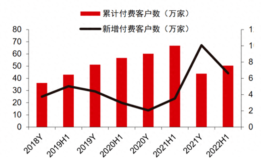用友在今年上半年软件业务收入同比下降-16.1%;从付费客户数量也可以看出,21年开始,累计付费用户数量出现明显下滑,今年的新增客户数也有下滑。