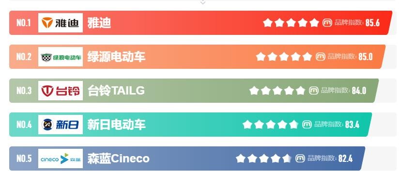 虽然6~10名在众多的品牌中,已经是不错的表现,但往往排行榜单中,这些排名还是容易被忽视,大家看排名还是比较倾向靠前的,那么,1到5名依次为:雅迪、绿源、台铃、新日、森蓝,下面具体来看看吧。