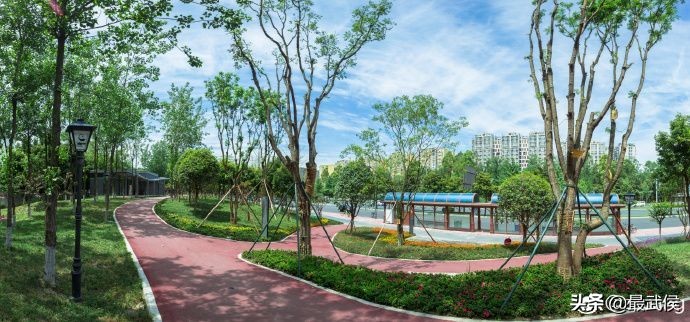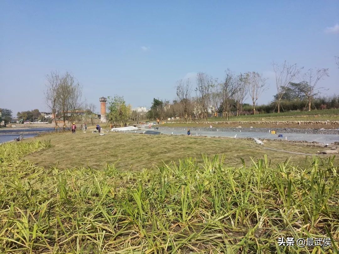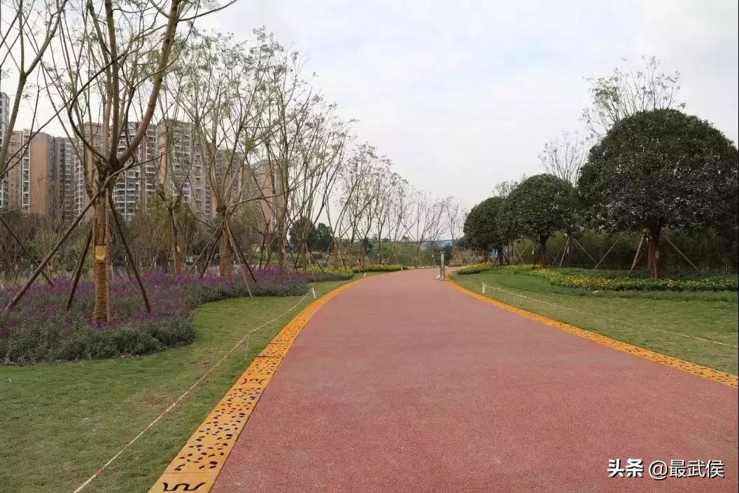 位置最高的骑行步道路面铺装早已完工,刻意打造具有武侯元素的水沟盖板有序地分布在步道两旁,两边栽种着樱花树、芙蓉树、桂花树等多种树木,早已铺装好的草坪正待春天的到来,重新焕发生命的活力。
