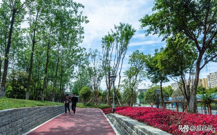 在这段2.1公里长的示范段,骑行步道、休闲步道和亲水步道三条步道顺着江安河的地形地势,由高至低分布。