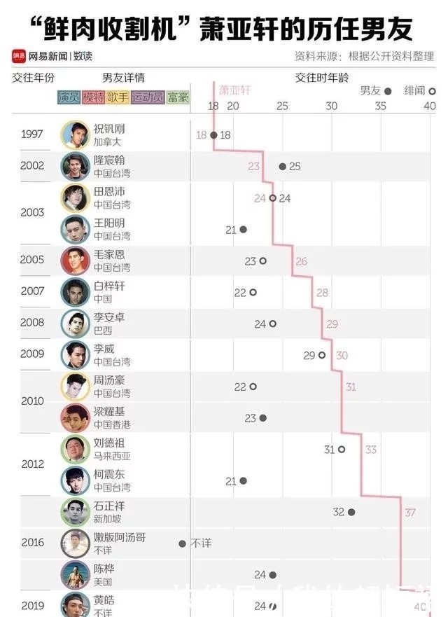 萧亚轩的第四任男友(著名演员王阳明)和第五任男友,都比萧亚轩小3岁,看来萧亚轩是认可“女大三抱金砖”的。从第九任男友开始,萧亚轩第一次找了比自己小10岁以上的男友周汤豪,从此一发不可收拾。