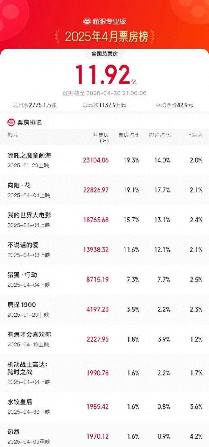 4月30日,据猫眼专业版数据,截至4月30日21时,2025年4月总票房11.92亿。其中,《哪吒之魔童闹海》连续4个月登顶月票房榜!