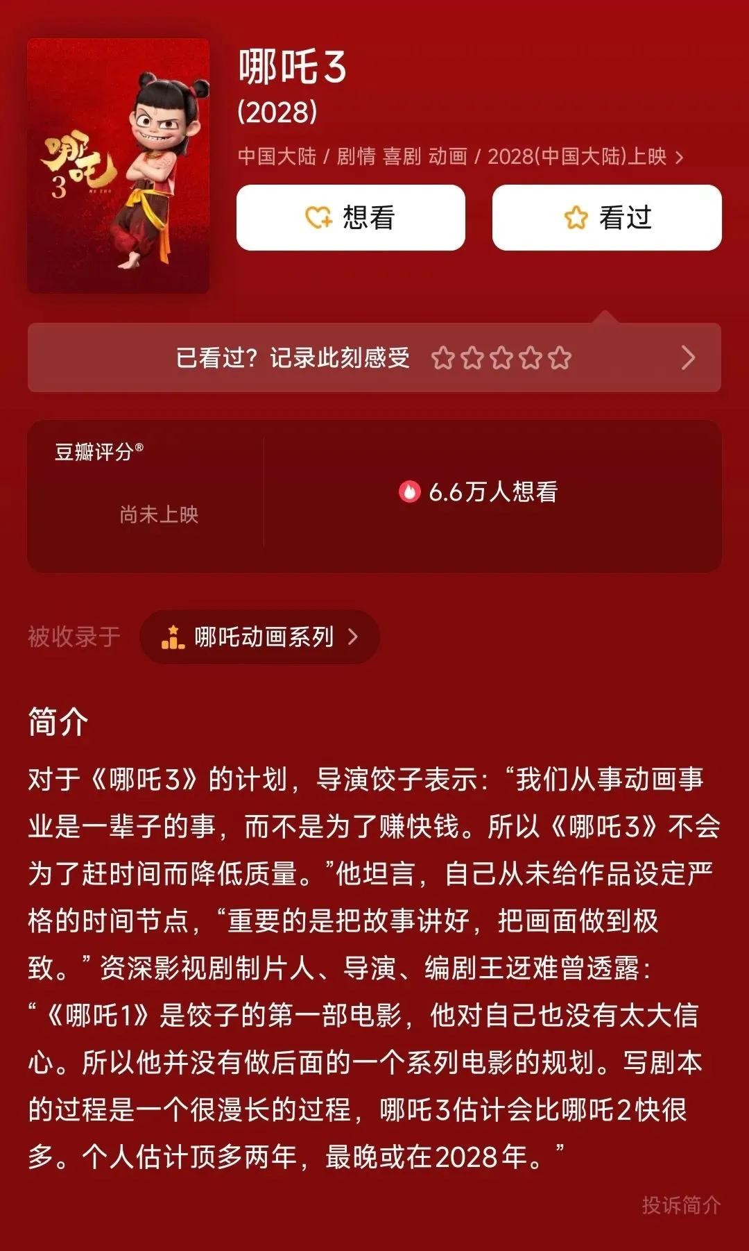 豆瓣App显示,《哪吒3》上映时间目前备注为2028年。