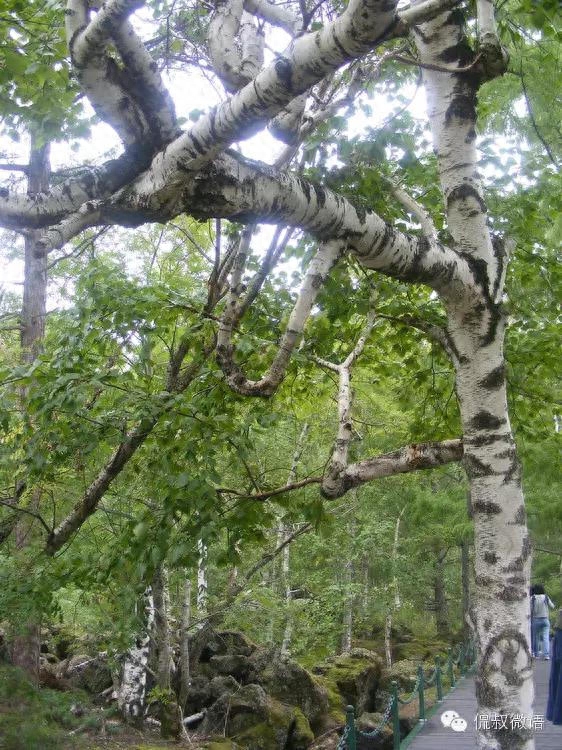 在感叹自然的伟大的同时,生命更是值得尊敬和膜拜的。据说火山喷发过后,火山杨生长在熔岩台地和石崖峭壁上,科考名称叫小黑杨。别看它只有二米多高,可是树龄一般都在几十年上百年以上,奇特的生存条件造就了它顽强的生命力,为了适应在岩石上生长,尽量缩小自己的体态,减少水分蒸发,而根部异常发达。可以想象在火山喷发之后,寂寞和空旷笼罩在这片沉静的大地,不知是鸟儿衔来了种子,还是风儿吹来了果实,“火山杨”就这样安家了,没有土壤,水分奇缺,但不妨碍他们的存活,多姿多彩的造型中孕含着顽强不屈的品格。
