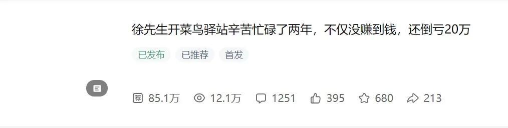 之前写过一篇徐先生开菜鸟驿站辛苦忙碌两年,不仅没赚到钱,还倒亏20万的原创文章,获得了85万的推荐,12万的阅读量,1251条评论,680个收藏,213次的转发,反响特别强烈,所以后面我又发了第二期视频,干菜鸟驿站能有多挣钱,看菜鸟驿站的老板怎么说,这两个一个是揭露菜鸟驿站存在的转让套路,一个是采访开菜鸟驿站的老板,但实际我本人没有开过菜鸟驿站。所以这次我为了这篇文章,我亲自盘下了一家菜鸟驿站,因为只有亲自去尝试了,你才能知道这一行真的是行还是不行的。也希望大家能给个一键三连支持下创作者。