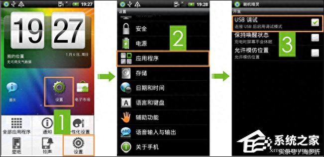 (1)安卓2.1-2.3系统打开USB调试方法:进入设置—应用程序,即可打开USB调试模式。
