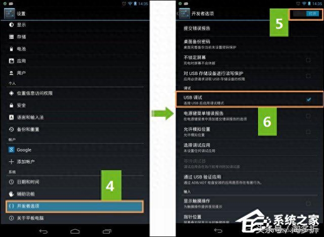 (3)安卓4.2-6.0系统打开USB调试方法:进入设置,找到“关于手机”,连续多次点击版本号,激活开发者选项。然后进入设置—开发者选项,打开USB调试模式。