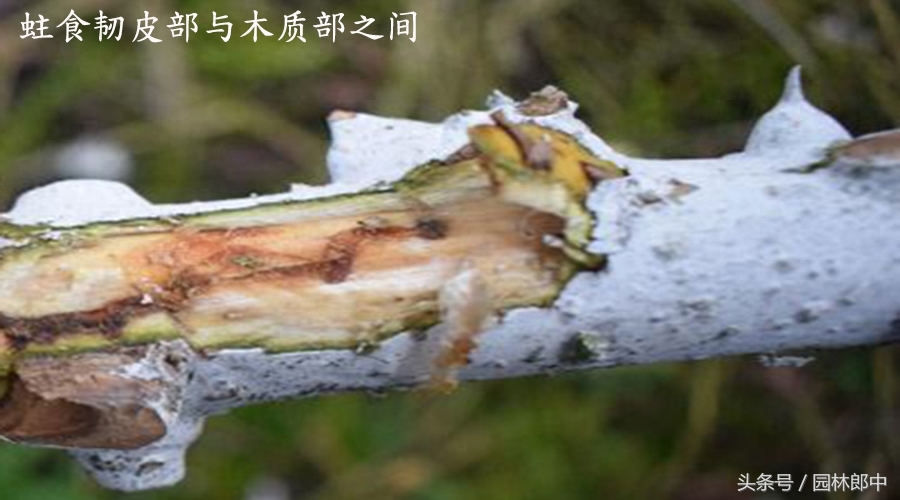 幼虫蛀食韧皮部与木质部之间: