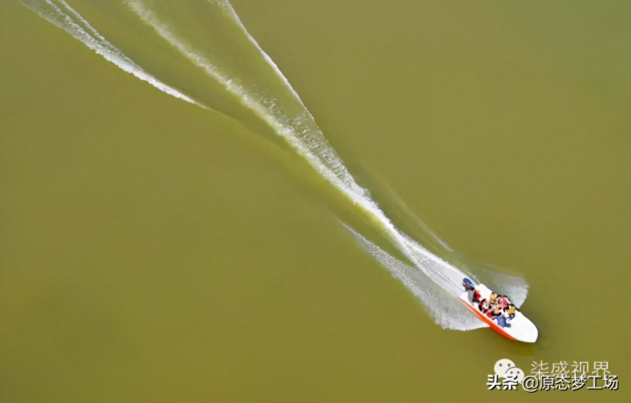 摩托艇在蹦极塔下的水面上浪出优美线条