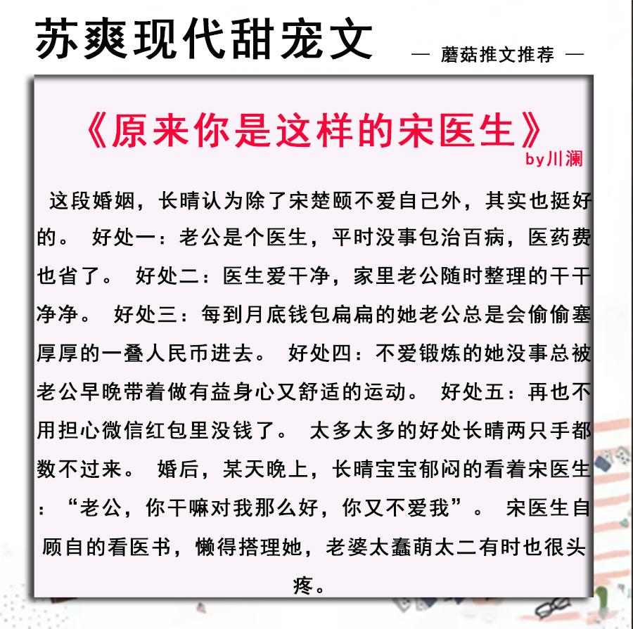 重点:这个小说真的是超甜了哦。也比较有名,相信很多小伙伴们都看过了或者听说过吧,一个是妖孽冷漠的医生男主,一个是萌蠢又二的女主,全文讲述两人的婚后相处,文风很轻松,里面有很多糖哦,萌萌哒,画面很甜。