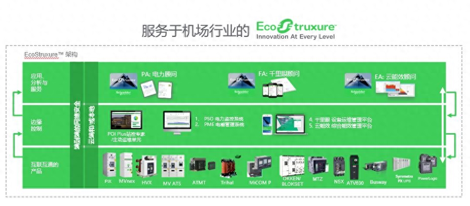 基于EcoStruxure™架构与平台,施耐德电气所打造的机场行业解决方案共分为三层:第一层是互联互通的产品,包括中低压设备,自动化设备,能耗及楼宇系统设备等;第二层是边缘控制层,如防雷监控系统、能源管理专家、电力监控专家、AVEVA数字化运营管理平台等;第三层是应用分析服务层,包括资产运维顾问、电力系统顾问、运维顾问、楼宇自控顾问、全生命周期服务等。这三层构架紧密联系,通过将更多数字化技术与行业知识相结合,以及全生命周期工具,助力众多客户高质量建设平安、绿色、智慧和人文的“四型机场”。不过,这样的表述,大家或许很难明白。