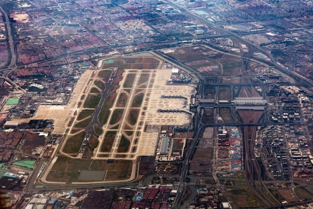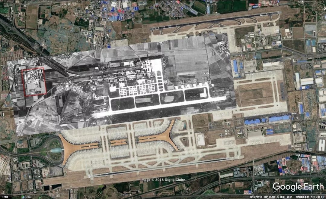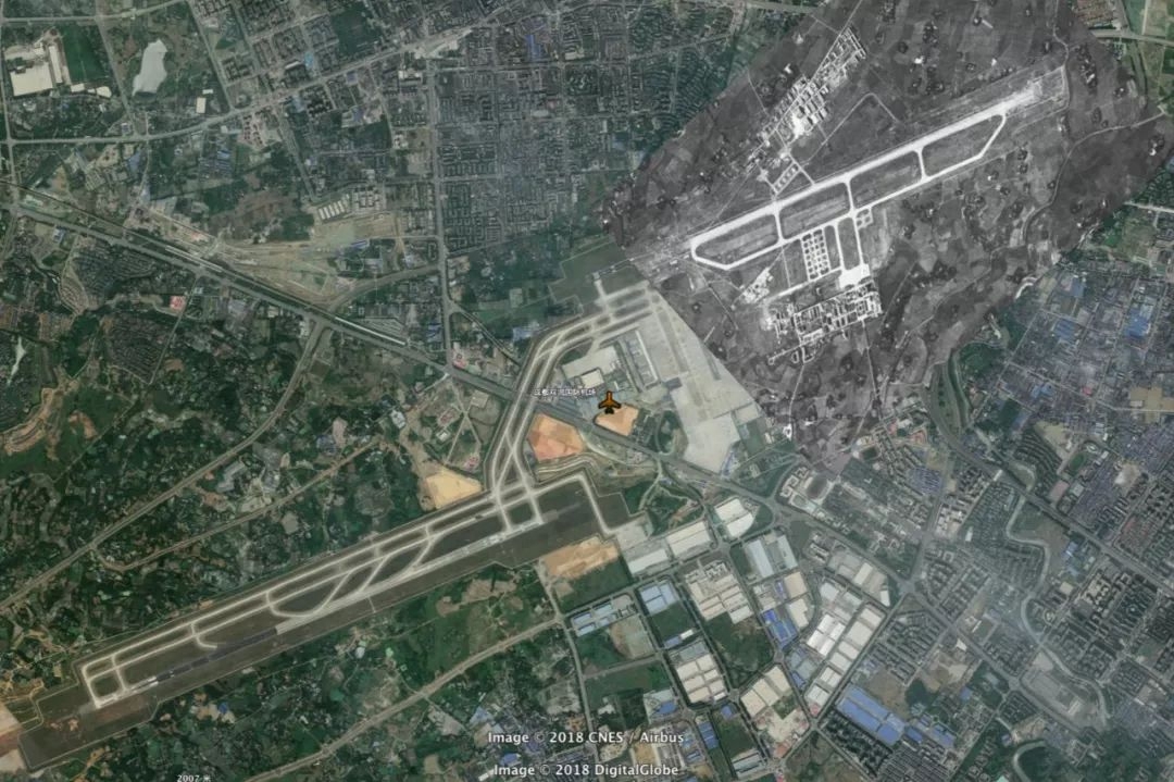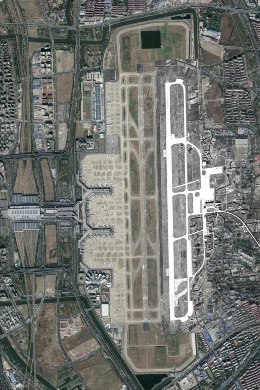 从下面三幅卫星照片可以看出,北京首都、成都双流和上海虹桥这三座中国地区级枢纽国际机场的变化。黑白的卫星照片拍摄于1968年前后,底图的彩色卫星影像拍摄于2018年,叠加在一起的2张照片时间跨度达到了50年。