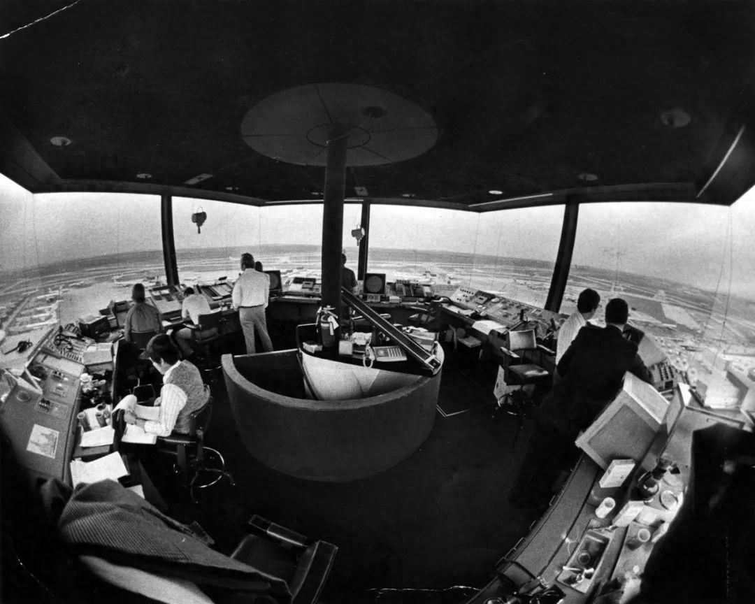 在管理和运行方面,领跑的选手仍然是芝加哥奥黑机场。通过这张拍摄于1973年的照片,我们看到,同期芝加哥奥黑机场的塔台已经拥有了望远镜、信号灯、无线电对讲机……毫无疑问,这是当时全球最先进的塔台之一,虽然今天的我们对这种景象已经司空见惯。