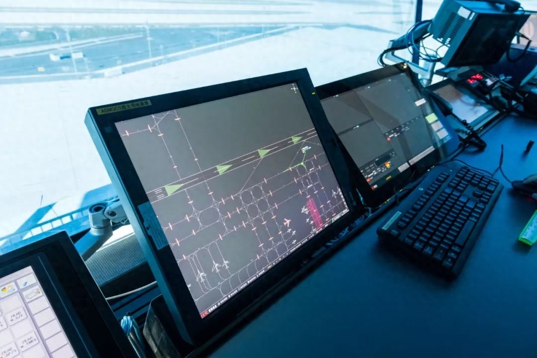 在“智慧机场”方面,大兴国际机场A-SMGCS(Advanced Surface Movement Guidance and Control System)系统(高级机场场面活动引导与控制系统,以下简称高级地面引导系统)相当于滑行道上的红绿灯,可以保障飞机在低能见度条件下,以最高效安全的方式在地面滑行。图为塔台管制席屏幕显示的滑行道实时状态。