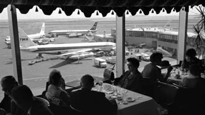 除了外部硬件设施的变化外,在那个岁月流金的年代里,旅客在机场航站楼内部候机时,也会享受到比今天好很多的服务。这幅照片拍摄于1959年的旧金山机场候机楼内,随着波音707和道格拉斯DC-8这类商用喷气式客机的服役,旅客的飞行时间被大大缩短,但航站楼内、以及机上的精致服务,又似乎将时间拉得绵长,使人沉浸其中。这正是属于那个岁月流金年代,人们在面对生活、畅谈梦想、展望未来时所具有的复杂气质与自由情怀。