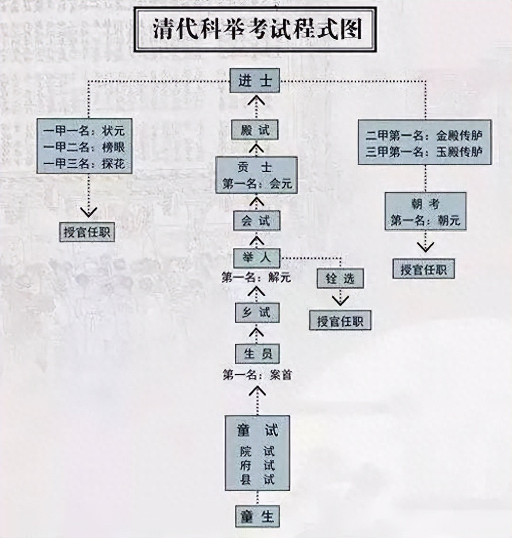 第一级是童试,先启蒙再苦读,然后参加县试、府试、院试而成为秀才。一般每个州府每年只有三十个名额,均分到各县大概也就只有5人左右。