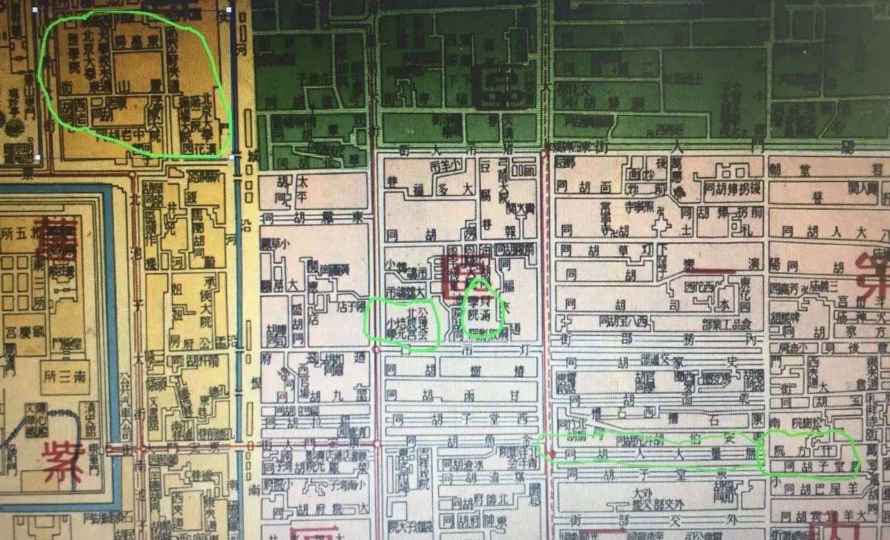 ►李佩家所在的无量大人胡同,及其求学的培元小学、贝满女中、北京大学位置图