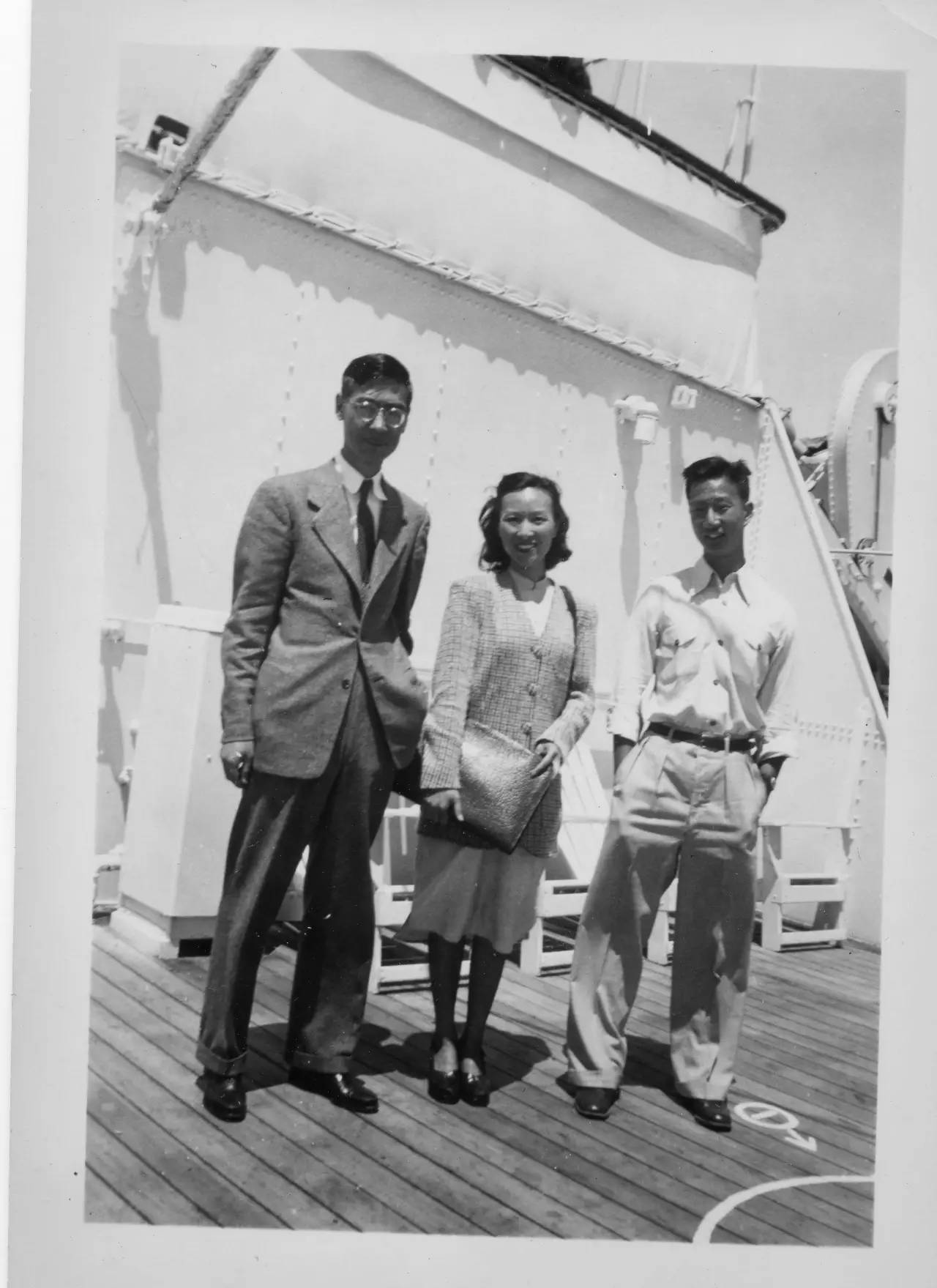 ►1956年9月,郭永怀(左)李佩(中)在回国的船上。照片提供:李伟格、郁百杨