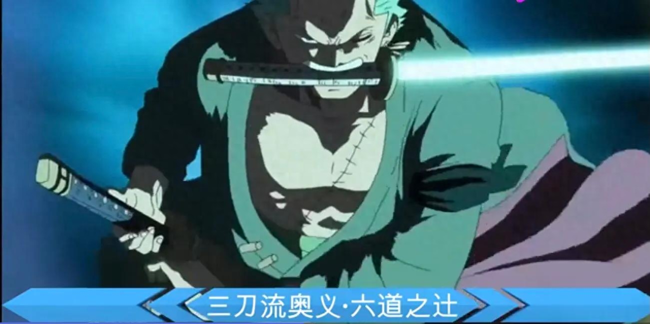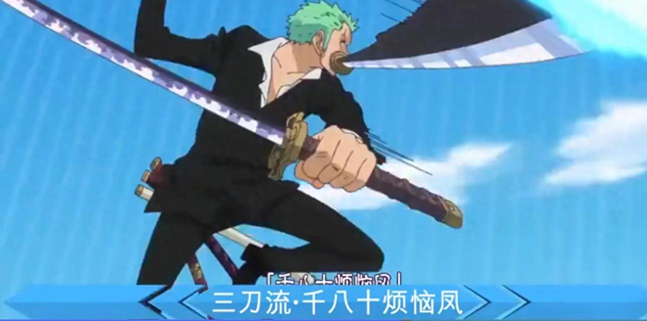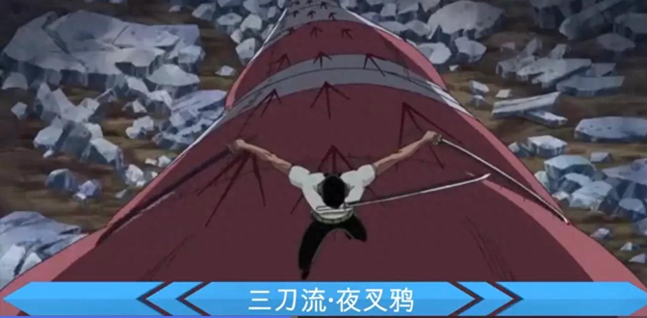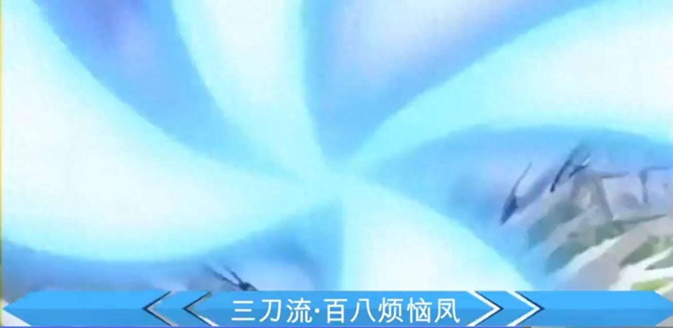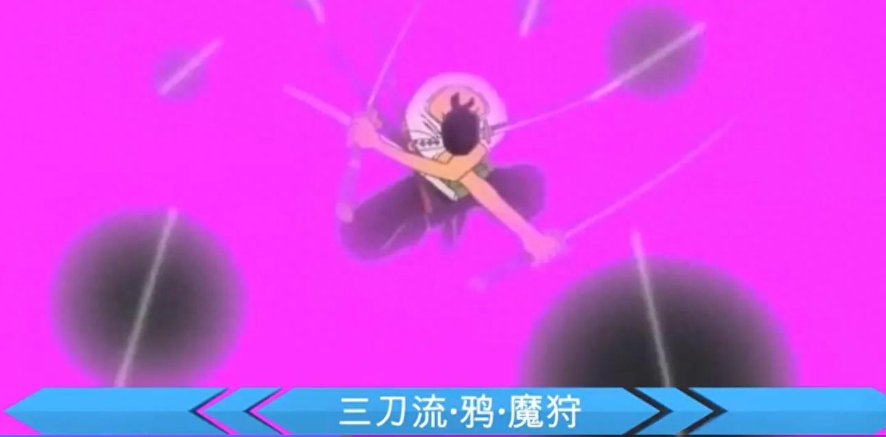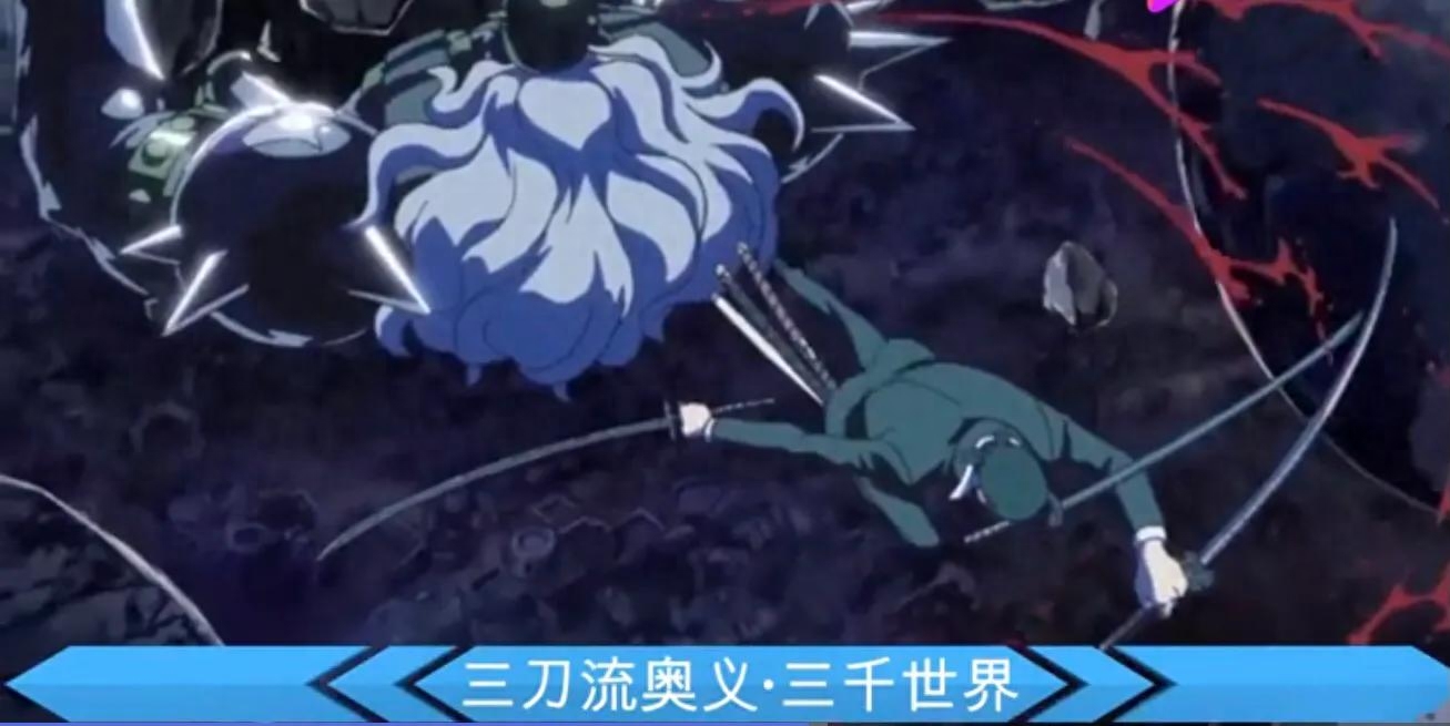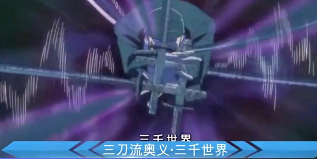 吟咏:“九山八海,无我不断者…三·千·世·界!”第一次使用是在和鹰眼打得时候,后来随能力提升成为三刀流最强奥义之一