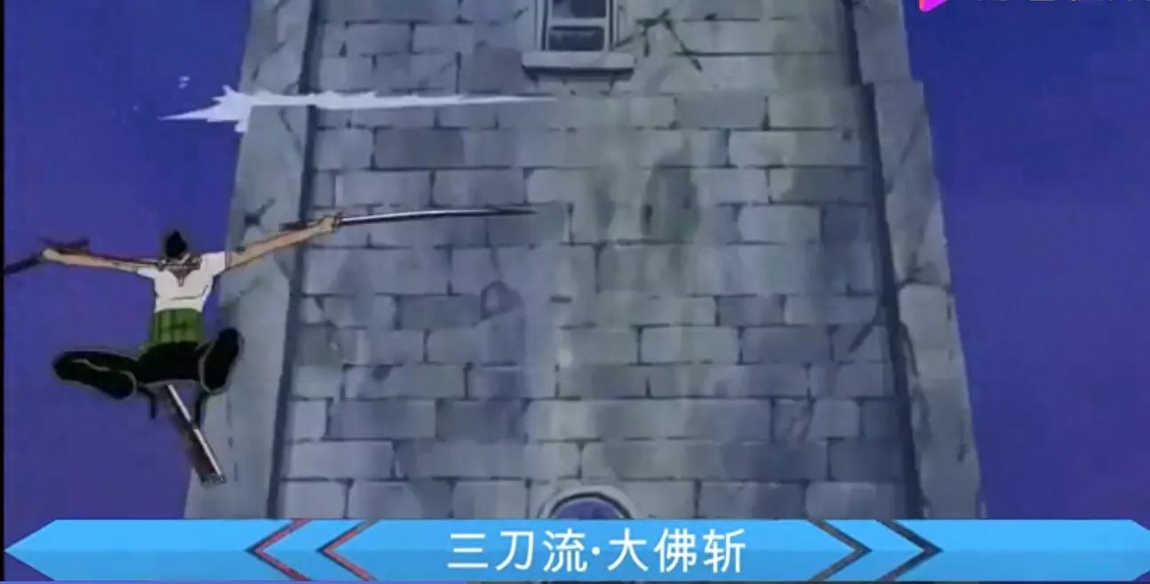 由乔巴将其抛向高空,让索隆在空中使出有如切割般的斩击。该招足以将一座大楼砍成多截