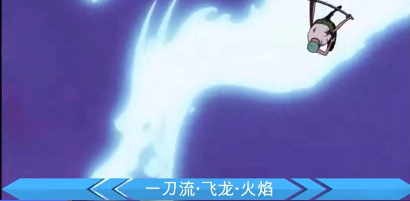 索隆跳到半空中随即单手向上翻开,紧握一文字,向前跳跃砍向身前,被砍中的敌人身体会随之燃烧(与龙马对决)