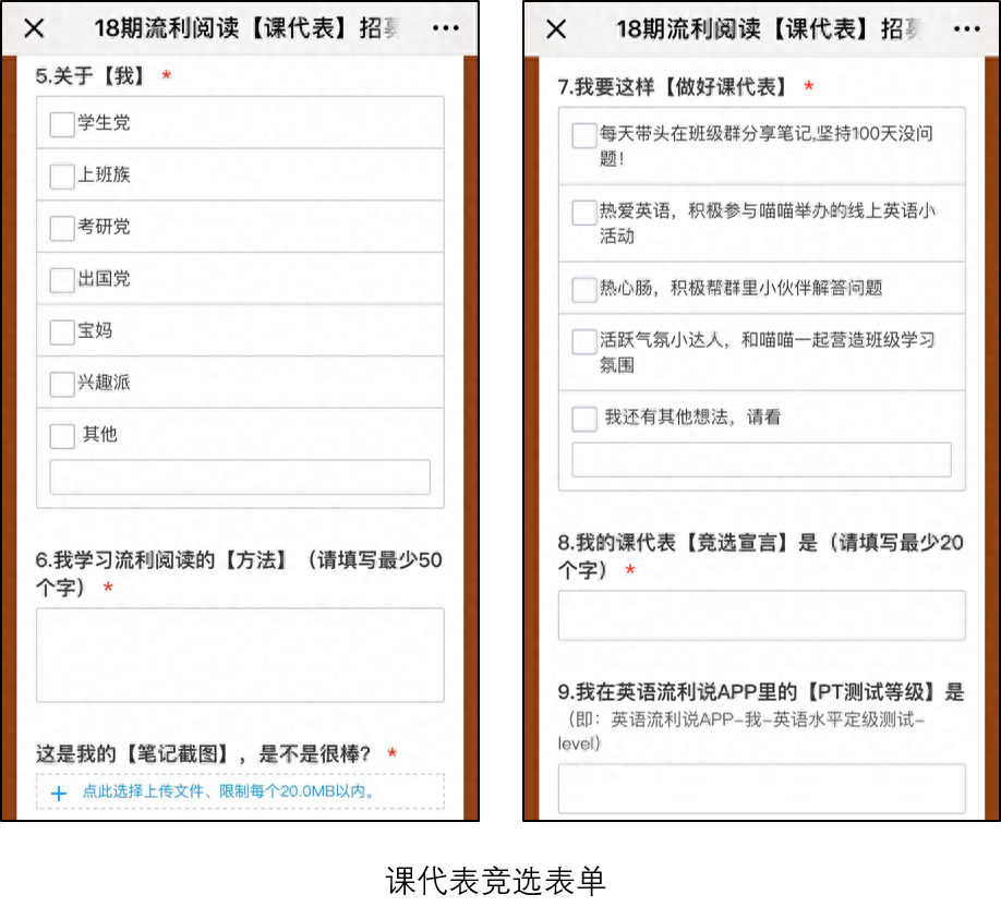报名竞选课代表时,需要填写个人职业、自身学习流利阅读的方法、流利说测试等级、将会如何当好课代表、竞选宣言等信息,并上传自己的学习笔记。换言之,同时拥有学习能力和付出意愿的学员才有资格成为KOL,真正起到带领学习的作用。