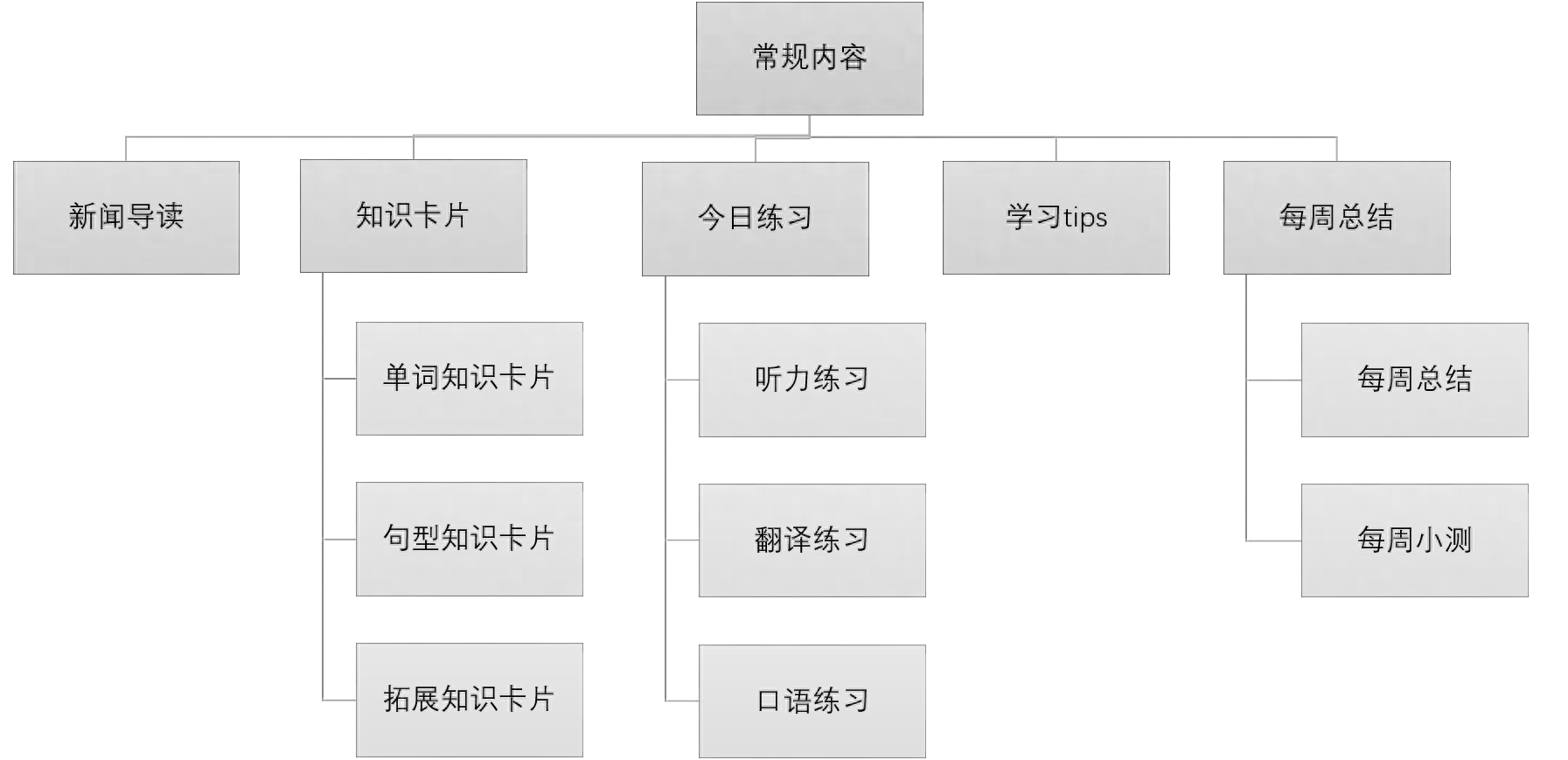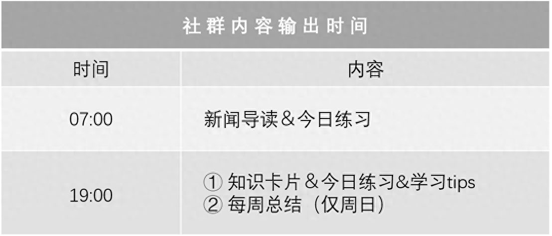 通过社群输出的常规内容分为 5 部分:新闻导读、知识卡片、今日练习、学习 tips 和每周总结。