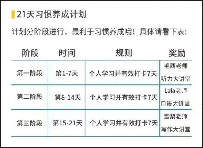 累计打卡80天返学费:首次购买流利阅读课程的用户,在课程100天有效期内,累计在朋友圈打卡满80条就可以拿回全额学费。累计学习80天可保留课程:在当期课程100天有效期内,累计阅读80天,即可保留课程2年。21天习惯养成计划:在第1-7天、第8-14天、第15-21天,用户完成每一阶段的学习任务并朋友圈,即可以获得对应的奖励。