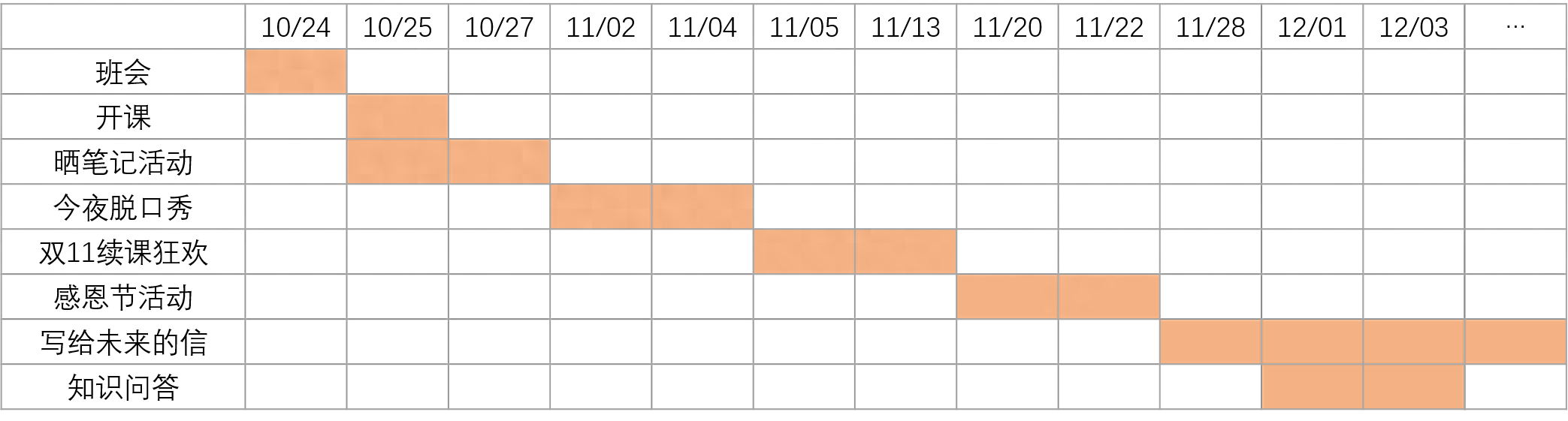 下面是一张活动汇总时间表,可以看到,大大小小的活动时间是很紧凑的。