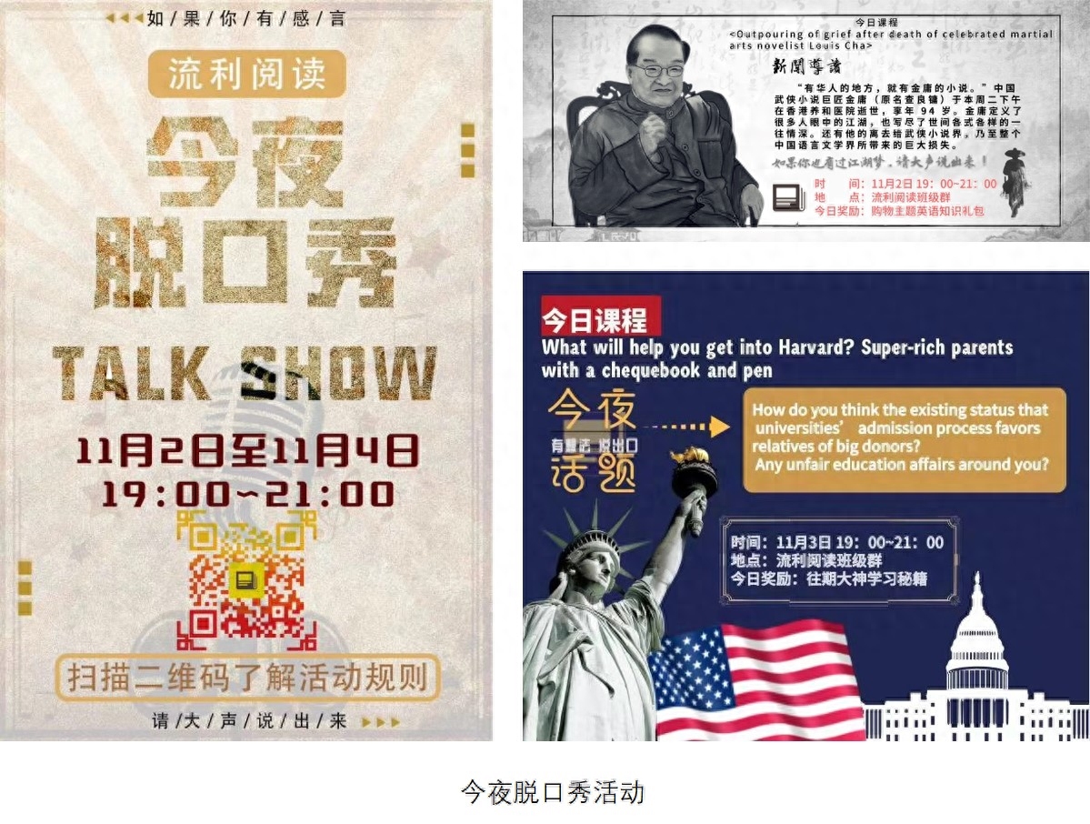 晒笔记得课程:开课后的前 3 天,任意 1 天在社群中分享自己的笔记,可获得奖励。今夜脱口秀:举办针对当日新闻的英语脱口秀,用户参加即可拿奖励。有奖问答:运营者在群中提出问题,用户在限定时间内回答正确即可获得奖励。