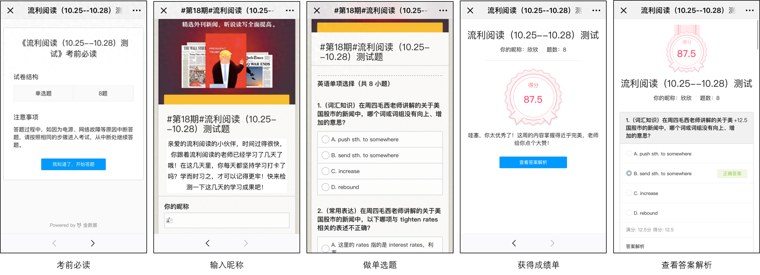 还会有一个小测试,一共是10道左右的单选题,内容涉及本周所学的词汇知识、常用表达、文章理解、背景知识、写作技巧、文化知识等。只需要5步即可完成这个测试,整个过程十分顺畅。
