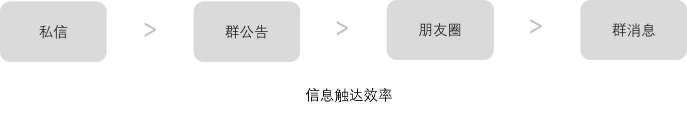当用户加入到一个社群中,运营者通常会添加他们的微信号。所以运营者其实拥有 4 种触达用户的渠道:群公告、群消息、私信和朋友圈。而且,触达效率是私信 > 群公告 > 朋友圈 > 群消息。