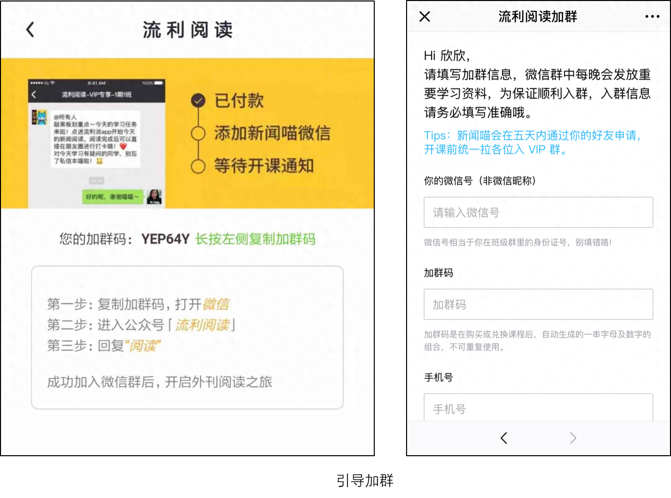 用户刚加入社群后,需要帮助他们建立起群体意识。为了降低管理成本,同时打造仪式感,「 流利阅读 」于开课前 1 天举行了班会,统一进行重要内容的告知。