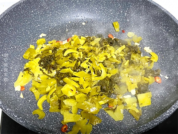 第三步:加入清洗好的酸菜段,开大火把酸菜炒干。很多朋友在制作酸菜鱼的时候,都没有炒酸菜的习惯,那么酸菜当中的异味就比较多,而且酸菜的口感也不够香脆,所以酸菜一定要提前炒一炒,把水分炒干,在水分挥发的过程当中,也会把酸菜当中的异味带走,这样后续在吃的时候,就可以吃到酸香脆口的酸菜啦。