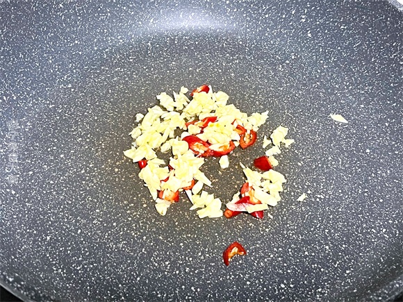 第二步:起锅,加入适量的食用油,加入切碎的蒜米和小米辣,炒出香味。
