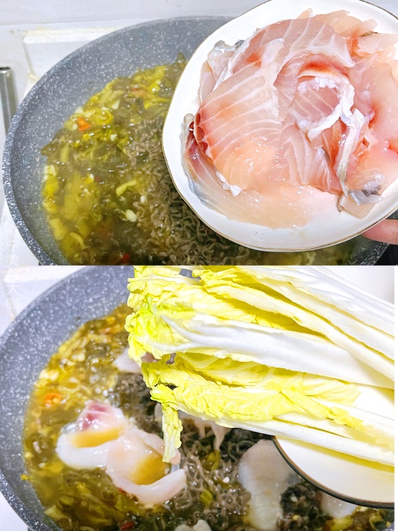 第五步:面饼煮到8分熟的时候,就可以加入生鱼片,在鱼肉下锅之后,就不要再用锅铲搅动了,不然鱼片会很容易被搅碎,我这次选择的是脆皖鱼,这类鱼肉口感香脆,韧性更强一些,如果大家选择的是草鱼或者是龙利鱼,那么就需要当心,不要过渡的搅拌汤汁。在这个时候还可以加入你喜欢的蔬菜,一起简单地烫一烫,等鱼肉变色熟透的时候,就可以出锅装盘啦。