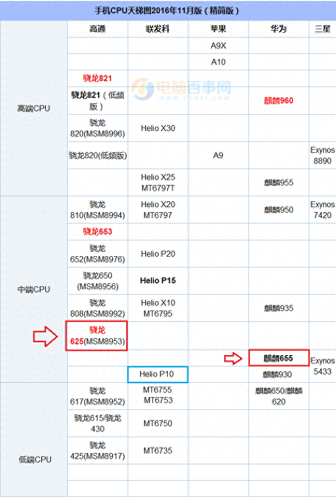 文章最后来看看骁龙625和麒麟655在最新的手机CPU天梯图中的位置,如下图标注所示。