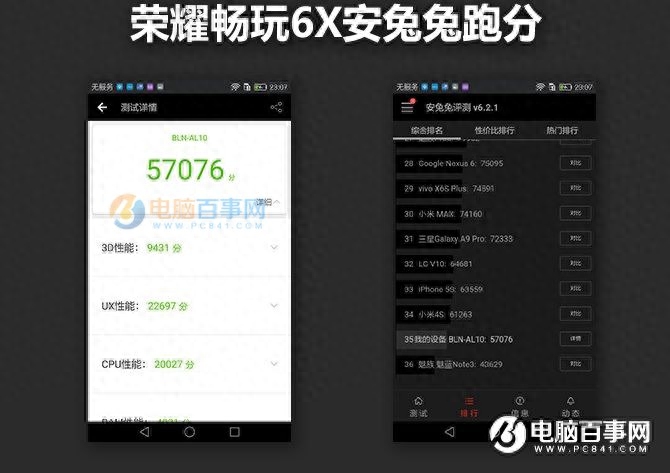 荣耀畅玩6X:麒麟655处理器 + 3GB/4GB RAM + 132GB/64GB ROM,配备双摄像头,支持全网通,售价999元起,安兔兔跑分成绩如下: