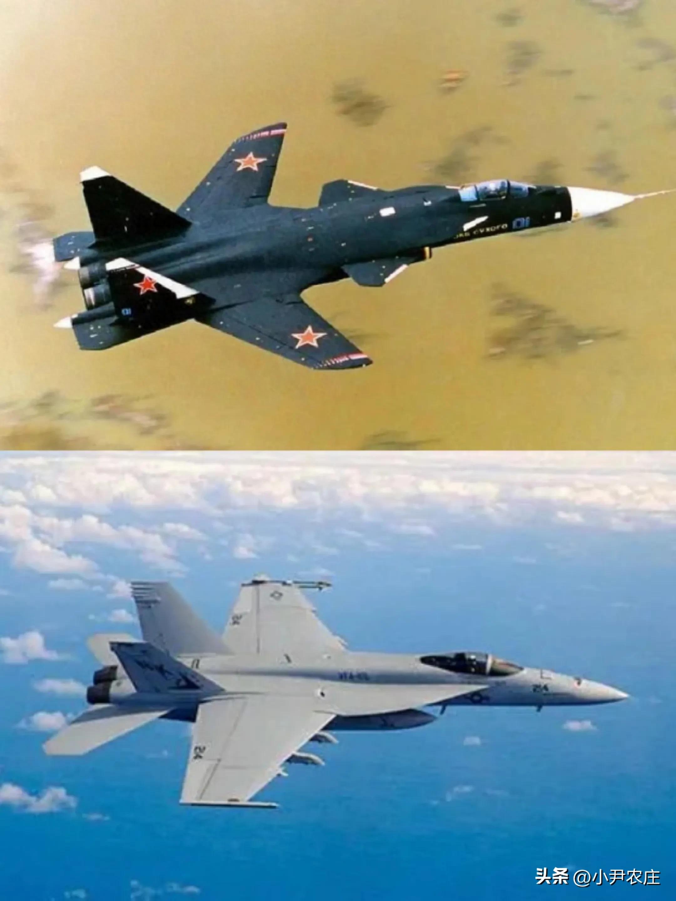 上面这架飞机是俄罗斯的苏-47战斗机,下面这架飞机是美国的F/A-18战斗机,仔细观察一下它俩,你会飞行它们之间有个非常明显的区别,就是苏-47战斗机的大翼是向前斜的,而F/A-18战斗机的大翼却是向后斜的。