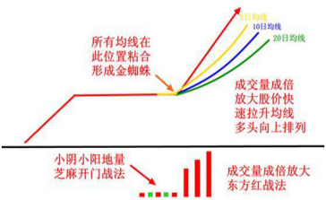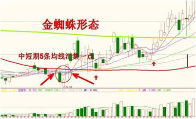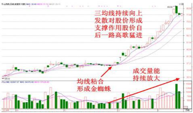 “金蜘蛛”买入法:是指从高位向下移动到低位后拐头向上汇合在一起的形态。由5日,10日,20日均线交叉于一点,然后股价站在交叉点之上的均线技术形态,标准的三线合一是比较少见的,俗称“金蜘蛛”。它要求至少有两条均线金叉,若是普通交叉或是死亡交叉那就够不成金蜘蛛。