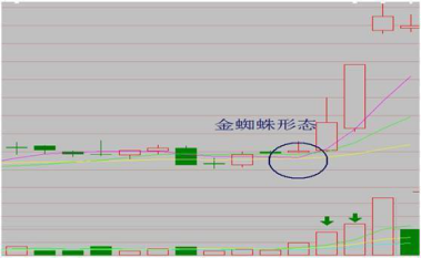 3、上述形态发生前,股价经历过一个平台横盘整理后,某天股价突然放量拉升,一阳定乾坤,三条均线被这一大阳线贯穿,金蜘蛛形态就此确立。