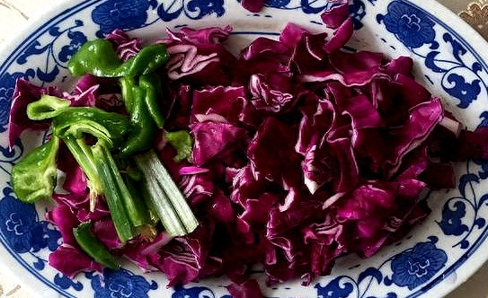 紫甘蓝是深受人们欢迎的一种绿色蔬菜,不仅是因为紫甘蓝营养价值很高,其含丰富的胡萝卜素、维生素、蛋白质、脂肪、粗纤维、钙、磷、铁等营养物质。而且可以简单方便做出做各种各样的健康养生菜肴,生食、炒食、煮食、凉拌、配色都可以,价格也比较便宜,耐存储。今天用昨天没有吃完的紫甘蓝,做一道非常开胃的下饭菜,紫甘蓝炒鸡蛋,希望大家喜欢。