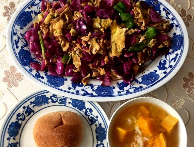 早餐推荐:手撕炒紫甘蓝炒鸡蛋、南瓜粥、山药小饼,养生健康食谱。