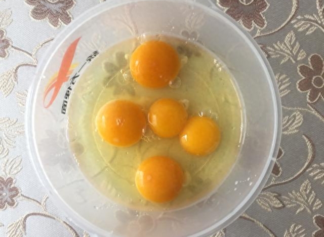 第二步、在碗中打入4个鸡蛋,呵呵里面有一个是双黄蛋,哈哈很幸运。用筷子打散,加点盐、胡椒粉、食用油,用力搅拌均匀备用,加点盐和食用油使得炒出的鸡蛋更香、更鲜嫩、色彩更光亮。