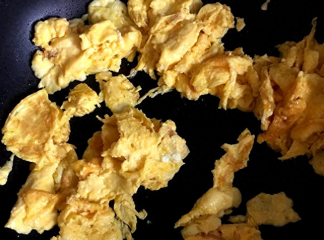 第三步、先炒鸡蛋,热锅冷油,将搅拌好的鸡蛋放入锅中,待鸡蛋液快要全部凝固的时候,用筷子快速划开;紫甘蓝可以生吃,所以本道菜可以先炒鸡蛋。