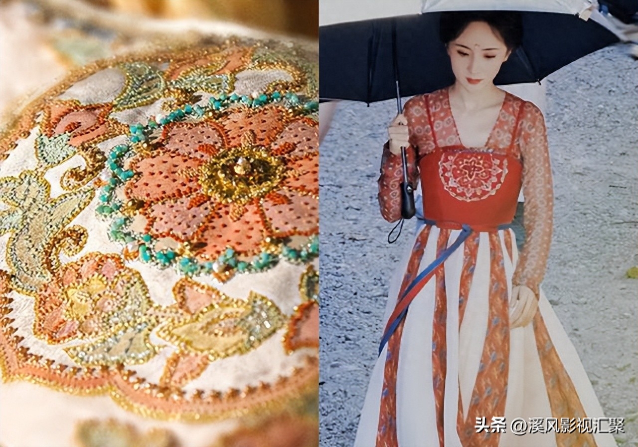 杨幂这套人间古典风格的造型,胸前的图案绣法,就有点接近打籽绣。