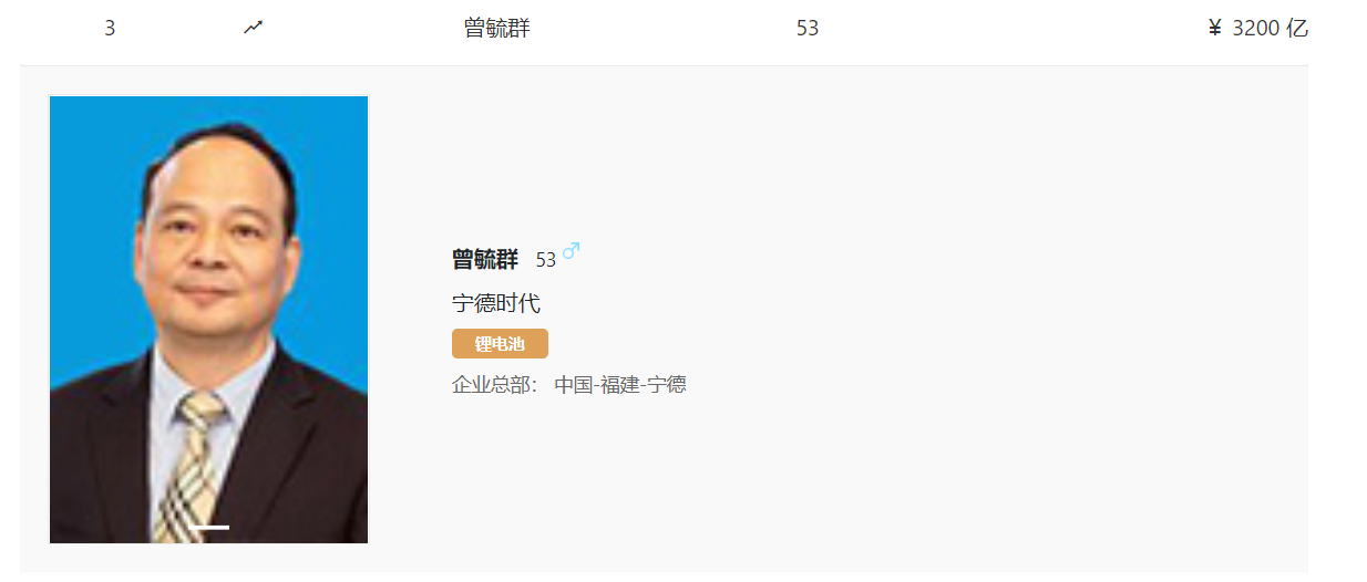 根据榜单,新能源汽车动力电池供应商宁德时代董事长曾毓群以3200亿元的财富首次进入前三,长城汽车的魏建军、韩雪娟夫妇以2180亿元排名第七。