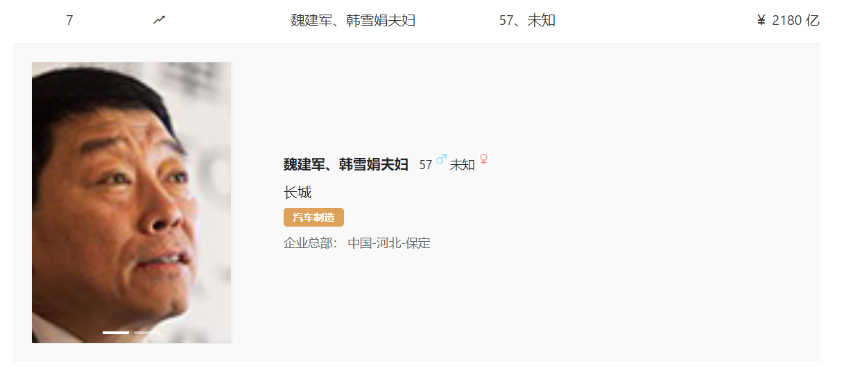长城汽车的魏建军、韩雪娟夫妇财富增长至去年的近5倍,增长了1730亿,以2180亿元跃居第七。