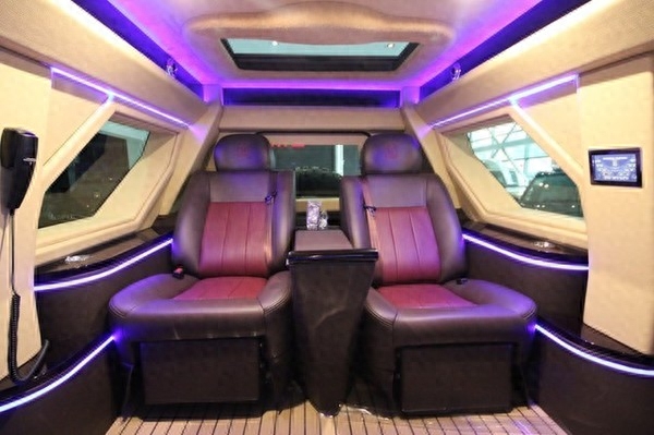 内饰采用了双色混搭,座椅纯手工缝制,看上去非常舒服,有着一种优雅古典的格调,特别是驾驶舱内有夜视系统、卫星导航.防生化毒气系统、供氧设备等安全设备,还有多媒体影音视讯系统、高科技卫星侦测系统。