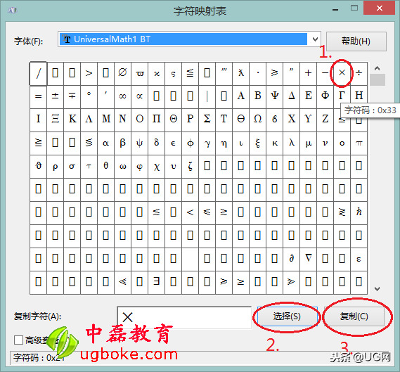 打开“字符映射表”对话框,如图所示,单击列表中的乘号,然后单击“选择”按钮,再单击“复制”按钮,关闭对话框。